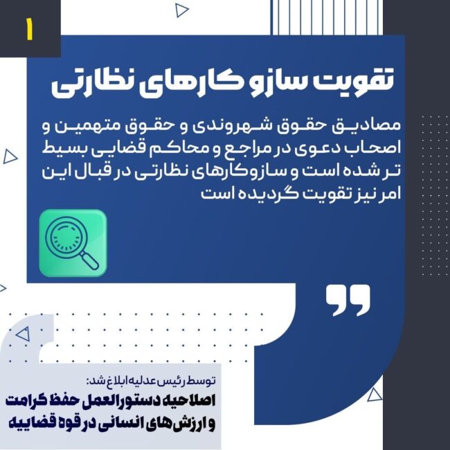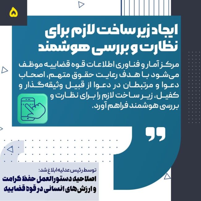 وفق اصلاحیه ابلاغ شده، در راستای ماده ۶ دستورالعمل حفظ کرامت و ارزشهای انسانی در قوه قضاییه ناظر بر رعایت اصول قانونی بودن جرم و مجازات و برائت، مرکز آمار و فناوری اطلاعات قوه قضاییه موظف میشود با هدف رعایت حقوق متهم، اصحاب دعوا و مرتبطان در دعوا از قبیل وثیقهگذار و کفیل، زیر ساخت لازم را برای نظارت و بررسی هوشمند فراهم آورد.