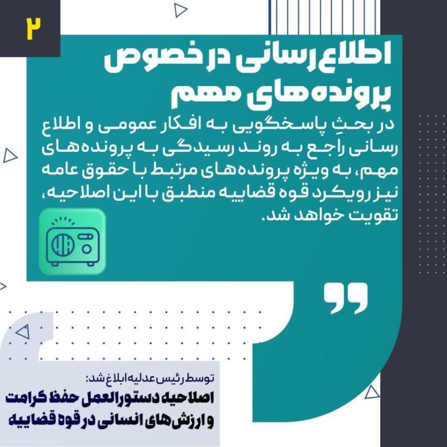 در بحثِ پاسخگویی به افکارعمومی و اطلاعرسانی راجع به روند رسیدگی به پروندههای مهم، به ویژه پروندههای مرتبط با حقوق عامه نیز رویکرد قوه قضاییه منطبق با این اصلاحیه، تقویت خواهد شد.