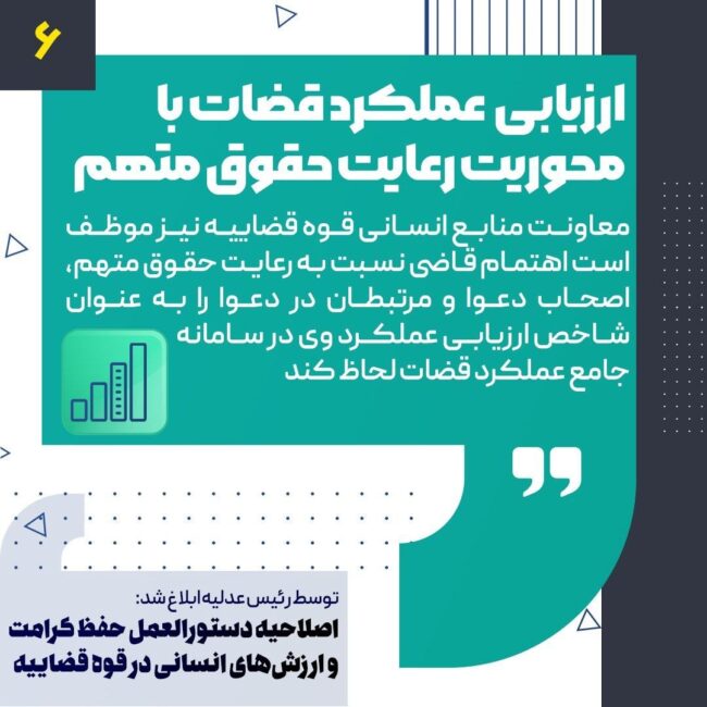 همچنین معاونت منابع انسانی قوه قضاییه نیز موظف است اهتمام قاضی نسبت به رعایت حقوق متهم، اصحاب دعوا و مرتبطان در دعوا را به عنوان شاخص ارزیابی عملکرد وی در سامانه جامع عملکرد قضات لحاظ کند.