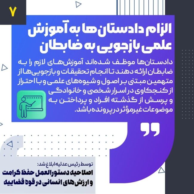 منطبق با اصلاحیه ابلاغ شده، در راستای ماده ۸ دستورالعمل حفظ کرامت و ارزشهای انسانی در قوه قضاییه ناظر بر رعایت اصل منع شکنجه برای اخذ اقرار، دادستانها موظف شدهاند آموزشهای لازم را به ضابطان ارائه دهند تا انجام تحقیقات و بازجوییها از متهمین مبتنی بر اصول و شیوههای علمی و با احتراز از کنجکاوی در اسرار شخصی و خانوادگی و پرسش از گذشته افراد و پرداختن به موضوعات غیرمؤثر در پرونده باشد. همچنین دادستانها مکلف شدهاند بر اجرای این امور و شئون توسط ضابطین، نظارت داشته باشند.