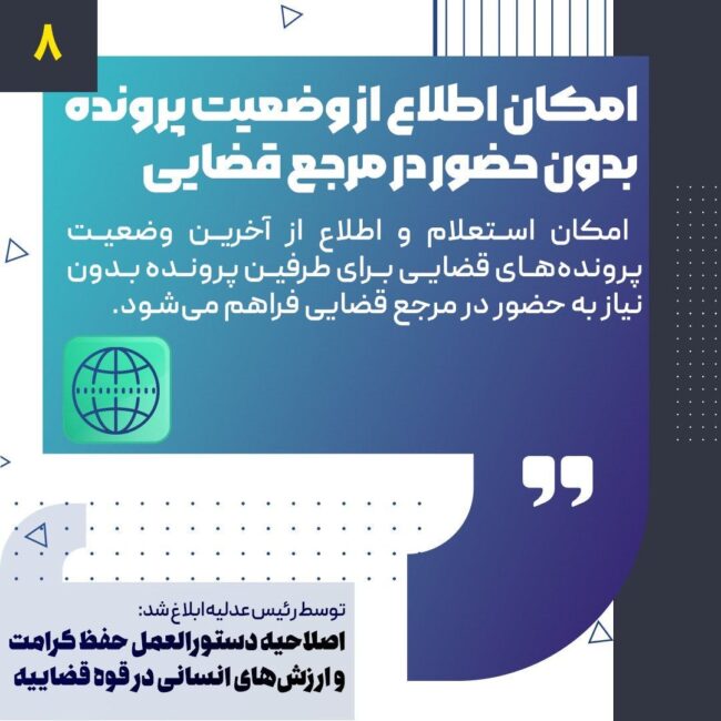 وفق اصلاحیه ابلاغ شده، در راستای ماده ۱۲ دستورالعمل حفظ کرامت و ارزشهای انسانی در قوه قضاییه ناظر بر حفظ حیثیت و کرامت ارباب رجوع، امکان استعلام و اطلاع از آخرین وضعیت پروندههای قضایی برای طرفین پرونده بدون نیاز به حضور در مرجع قضایی فراهم میشود.